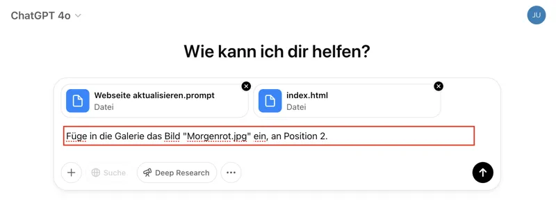 Du kannst die Anforderungen ein einfacher Sprache formulieren, z.B. "Füge das Bild 'Morgenrot.jpg' in die Galerie ein, an Position 2", "Verschiebe Bild 3 an Position 5", "Entferne Bild 4".